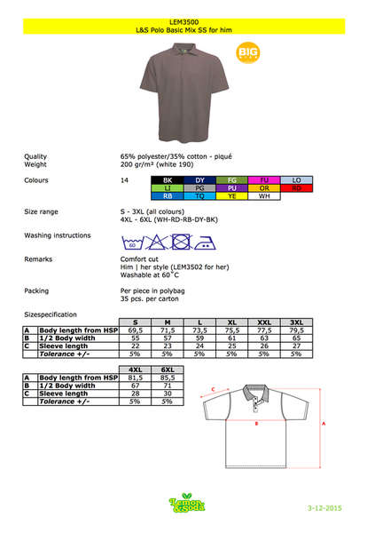 L&S POLO BASIC MIX SS FOR HIM maattabel